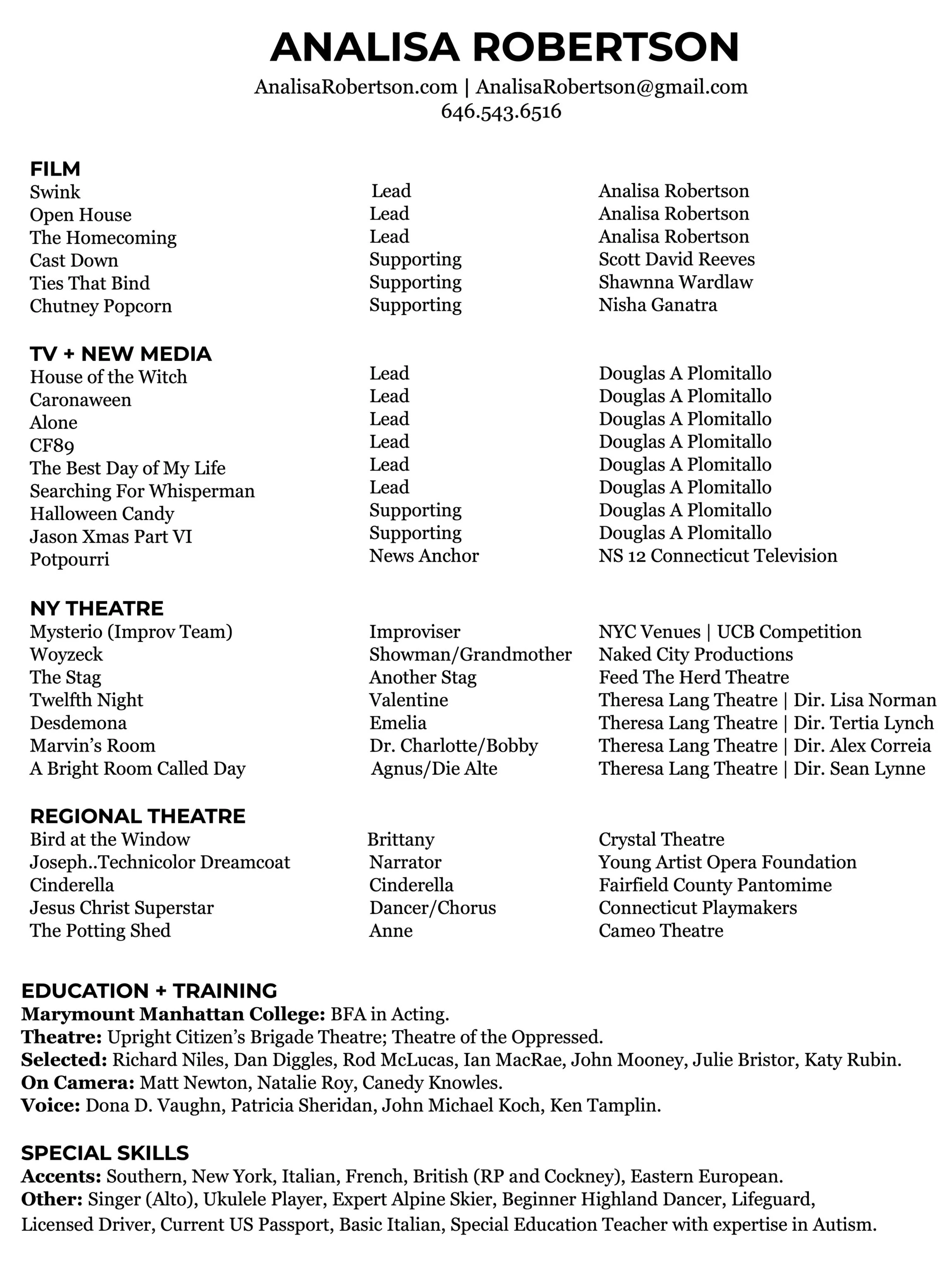Download headshot + resume using the buttons below. You can also find Analisa on: